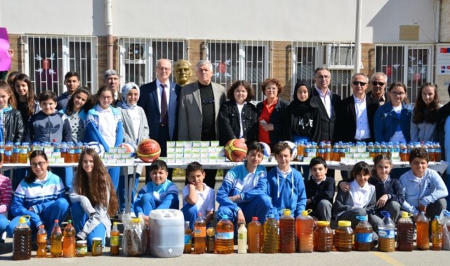 Bitkisel atık yağların doğaya verdiği zararı önlemek ve atık yağların atılmasından kaynaklanacak kirlilikten korunmak amacıyla Gemlik Belediyesi Temizlik İşleri Müdürlüğü tarafından başlatılan Atık Yağ Toplama Kampanyası’na vatandaşların desteği giderek büyüyor.Gemlik Belediye Başkanı Mehmet Uğur Sertaslan ‘ın talimatları doğrultusunda yürütülen kampanyaya son olarak Lale Kemal Kılıç İlkokulu öğretmen ve öğrencilerinden büyük destek geldi.Bir damlası tonlarca temiz su ve toprağı kirleten atık yağları okullarında biriktiren öğrenciler bu proje sayesinde hem çevreyi korumanın hem de sağlıklı bir gelecek için adım atmanın gururunu duydular.Proje kapsamında 212 litreye yakın evsel atık yağ toplayan öğretmen ve öğrencilere Gemlik Belediye Başkan Yardımcısı Bayram Demir, basketbol, futbol ve voleybol toplarının yanı sıra zeytinyağlı sabun hediye ederek, projeye verdikleri destekten ötürü teşekkür etti.Öğrencilerle okulun bahçesinde bir araya gelen Belediye Başkan Yardımcısı Bayram Demir, Çevreye ne kadar çok sahip çıkarsak o oranda başarılı oluruz. Atık yağlardan, pillere varıncaya kadar çevreyi kirleten tüm etkenler kanserojendir” dedi. Geleceğe sahip çıkmak için okul çağındaki çocuklara çevre bilincinin aşılanması gerektiğini vurgulayan Başkan Demir, kampanyaya gösterdikleri duyarlılıktan doları tüm öğretmen ve öğrencileri kutladı.Çekilen toplu fotoğrafın ardından hediye teslim töreni sona erdi.