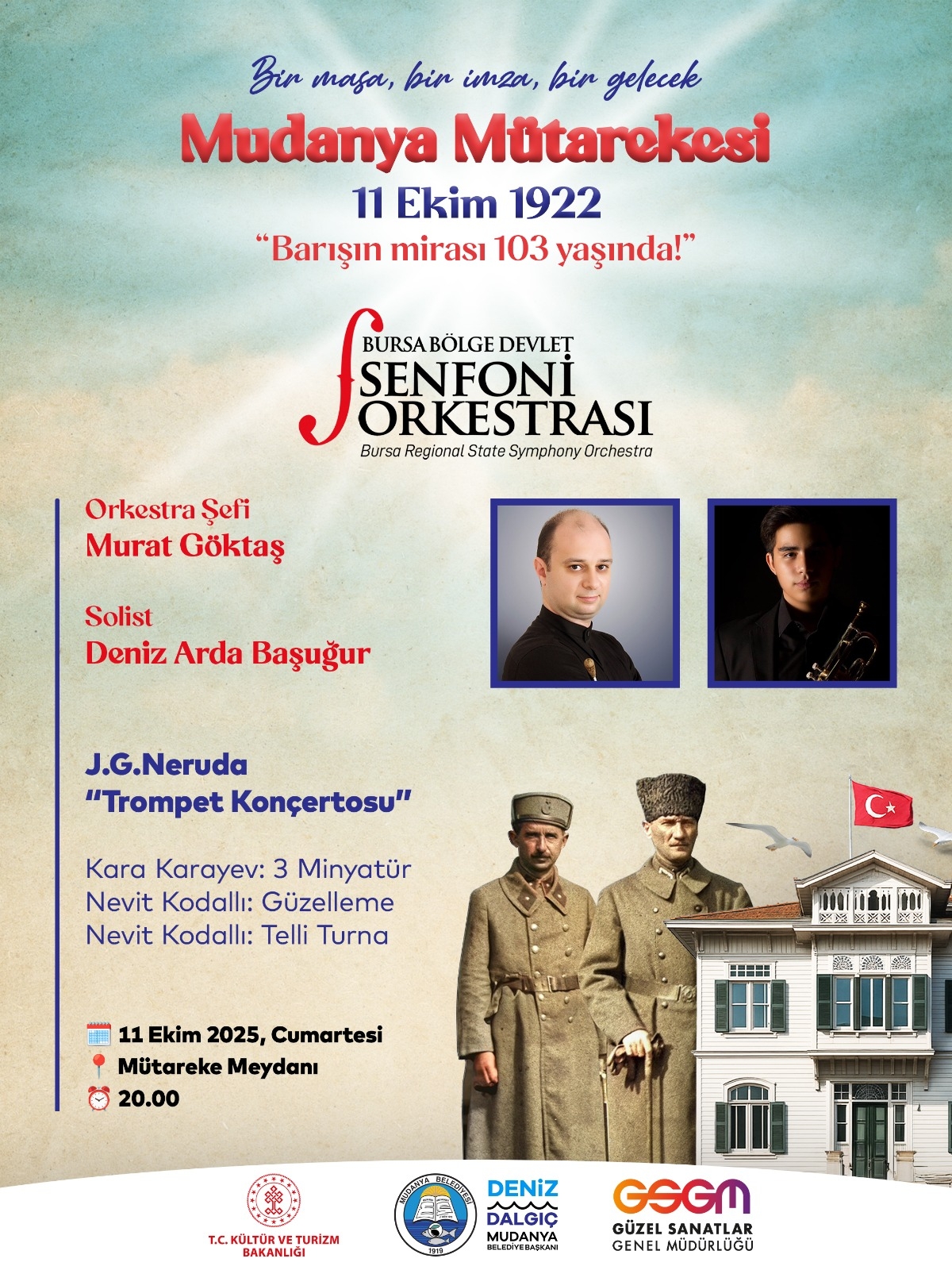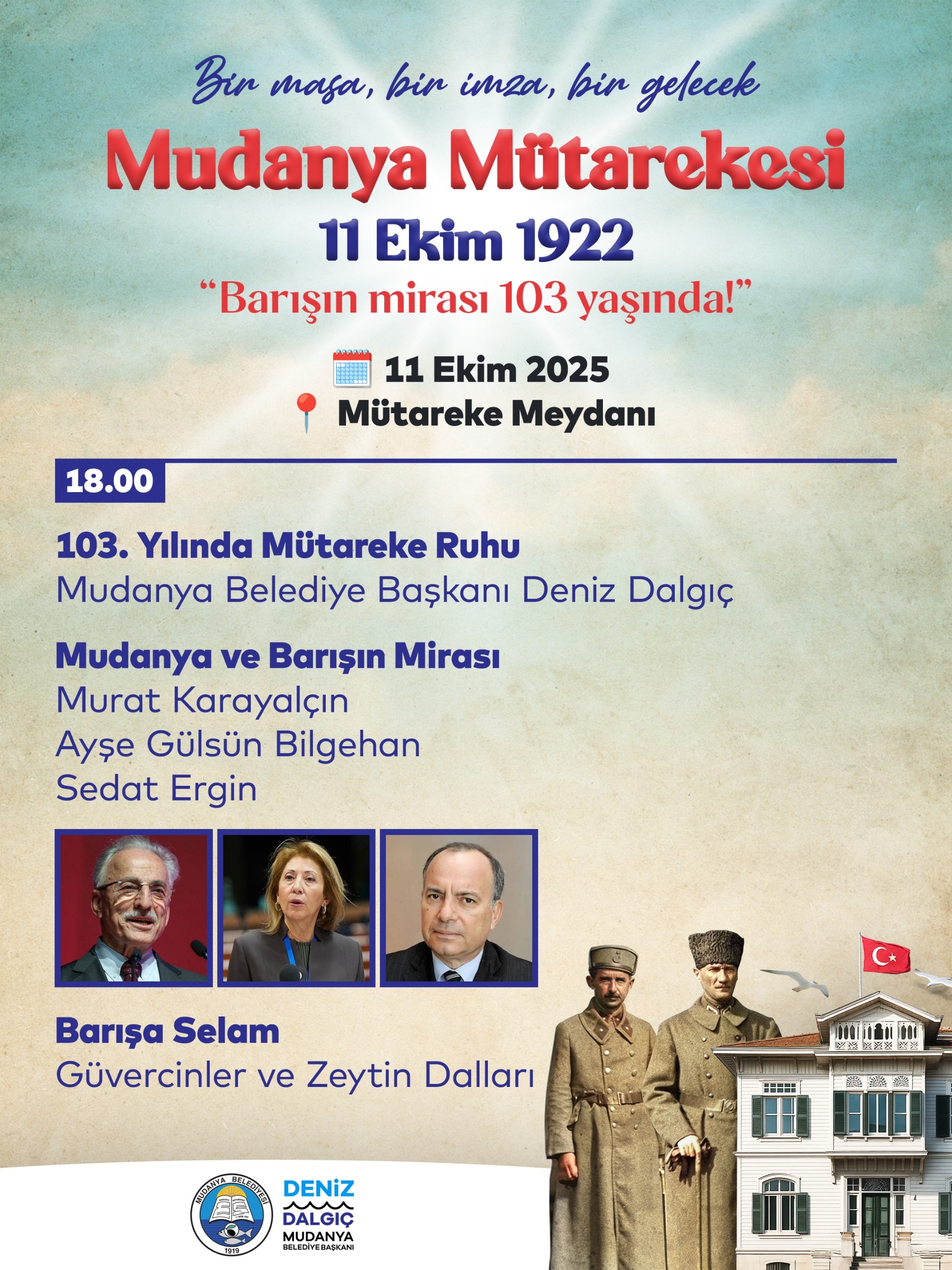 Mudanya Belediyesi, Türkiye’nin bağımsızlık yolundaki dönüm noktası olan Mudanya Mütarekesi’nin 103. yıl dönümünü “Bir masa, bir imza, bir gelecek” temasıyla kutlayacak. Başkan Deniz Dalgıç, “Mudanya, barıştan vazgeçmeyenlerin kentidir” mesajıyla tüm barış sevdalılarını Mütareke Meydanı’na davet etti. Türkiye’nin bağımsızlık yolundaki en önemli dönüm noktalarından biri olan Mudanya Mütarekesi’nin imzalanışının 103. yılı, Mudanya Belediyesi tarafından düzenlenecek etkinliklerle kutlanacak.Kutlamalar, 11 Ekim Cuma günü saat 10.00’da yapılacak resmi törenle başlayacak. Gün boyu sürecek program kapsamında, saat 16.30’da Türk Yıldızları Mudanya semalarında gösteri uçuşu gerçekleştirecek. Saat 18.00’de ise “Mudanya ve Barışın Mirası” başlıklı söyleşide Dışişleri eski Bakanı Murat Karayalçın, İnönü Vakfı Başkan Yardımcısı, İsmet İnönü’nün torunu Ayşe Gülsün Bilgehan ile gazeteci Sedat Ergin Mudanyalılarla bir araya gelecek.Barış güvercinlerinin gökyüzüne salınacağı, barışın simgesi zeytin dallarının denizle buluşacağı kutlamalar, saat 20.00’de Bursa Bölge Devlet Senfoni Orkestrası konseriyle sona erecek.BARIŞ SEVDALILARINA ÇAĞRIMudanya Belediye Başkanı Deniz Dalgıç, 103 yıl önce atılan barış imzasının hala yol gösterici olduğunu belirterek, “Mudanya’dan yükselecek barış ve özgürlük sesi, tüm dünyaya yayılacak” dedi. “103 yıl önce atılan o imza; şiddetin ve savaşların yerini uzlaşının aldığı, barışın hakim olduğu bir dünyanın temellerini atmamız için bize yol gösteriyor. Bağımsızlık ve özgürlük mücadelesini veren başta Gazi Mustafa Kemal Atatürk ve İsmet İnönü olmak üzere tüm kahramanlarımızı saygıyla ve minnetle anıyoruz.” diyen Dalgıç, sözlerini şöyle sürdürdü:“Mudanya Mütarekesi ile bağımsızlık meşalesi yeniden parladı, özgürlük inancı perçinlendi. Bugün biz de bu değerli mirasa sahip çıkmanın onurunu yaşıyoruz. Bir masa kuruldu, bir imza atıldı, bir gelecek kuruldu. 103 yıl önce barış burada yazıldı. Mudanya, barıştan vazgeçmeyenlerin kentidir. 11 Ekim’de, geleceğin doğduğu Mütareke Meydanı’na Cumhuriyet ve barış sevdalılarını bekliyoruz.”MUDANYA BELEDİYESİ BASIN BÜROSU
