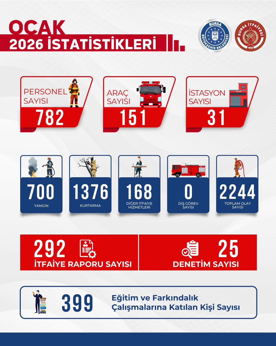 Ocak ayında 700 yangına müdahale eden ekipler, 1376 kurtarma olayına katıldı. Ekipler, 168 diğer itfaiye hizmetleriyle birlikte Ocak ayı boyunca toplam 2244 olaya müdahale etti. Ayrıca 399 kişiye eğitim verilirken, olaylarla alakalı 292 itfaiye raporu hazırlandı ve 25 denetim gerçekleştirildi.