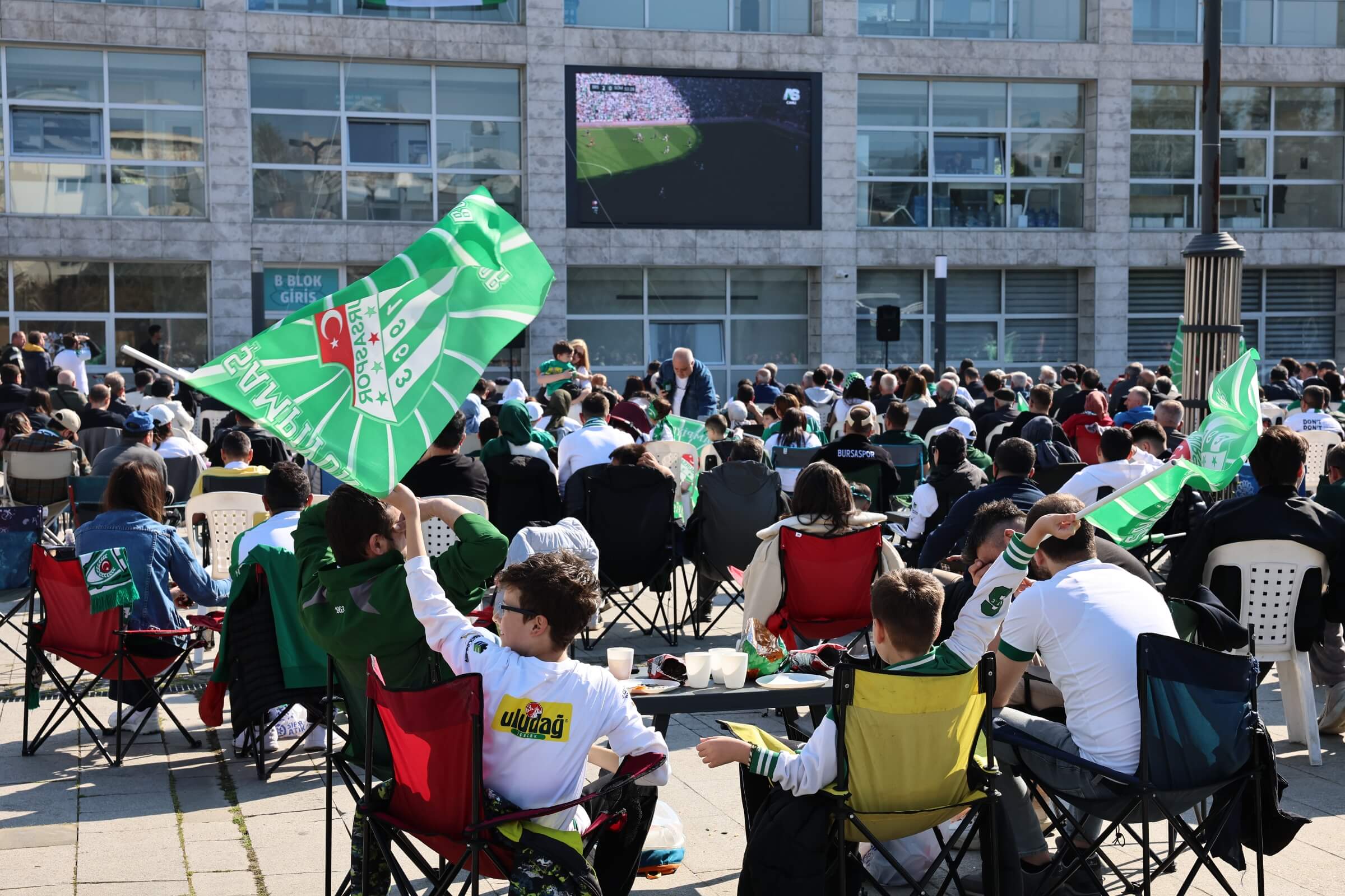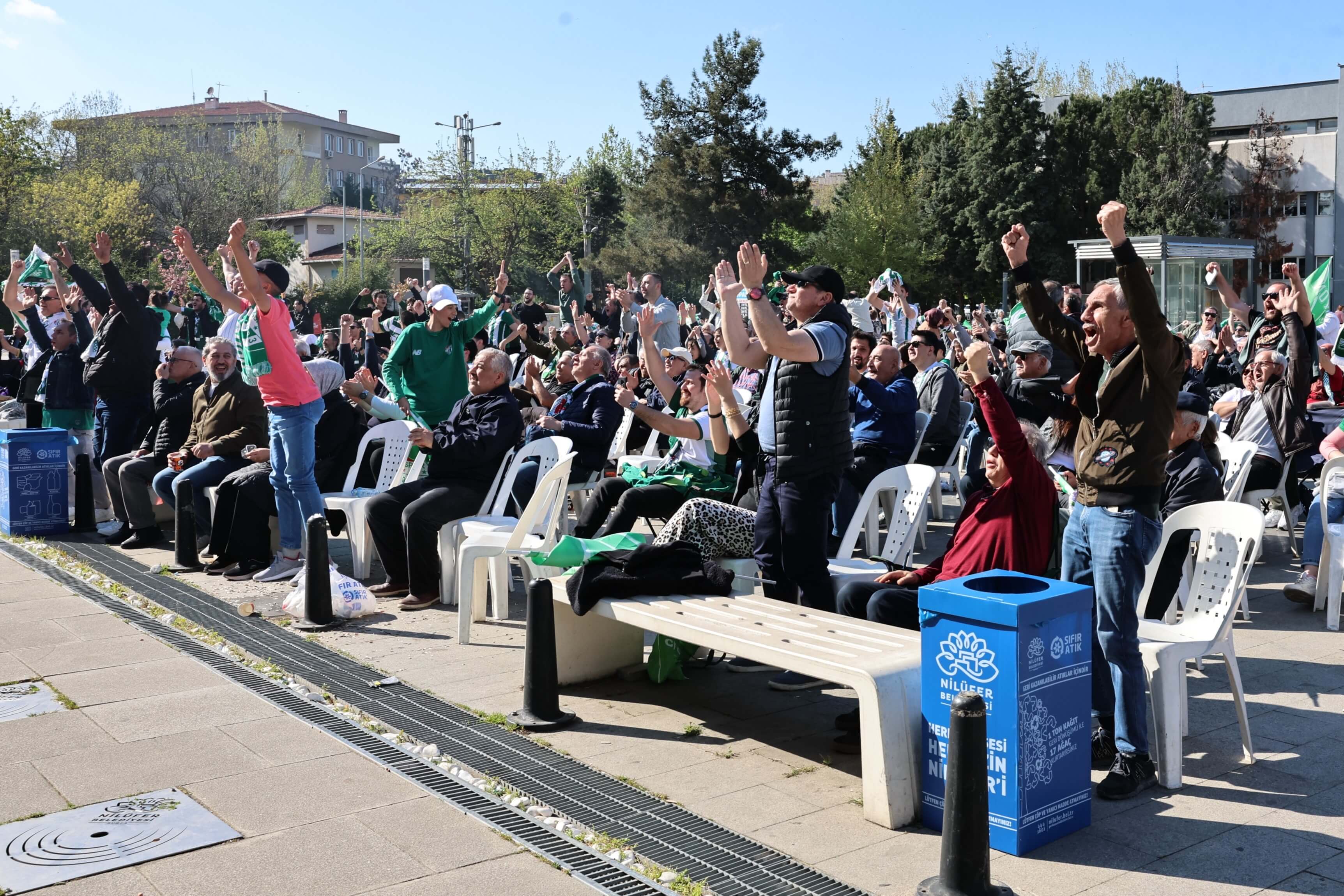 TFF Nesine 2. Lig’de şampiyonluk düğümünün çözüldüğü müsabaka, Nilüfer Belediyesi’nin organizasyonuyla Halk Evi önündeki Cumhuriyet Meydanı’na taşındı. “Omuz Omuza Zafer Yolu” sloganıyla düzenlenen etkinlikte 7’den 70’e yüzlerce yeşil beyazlı takımın sevdalısı tarihi ana tanıklık etti.