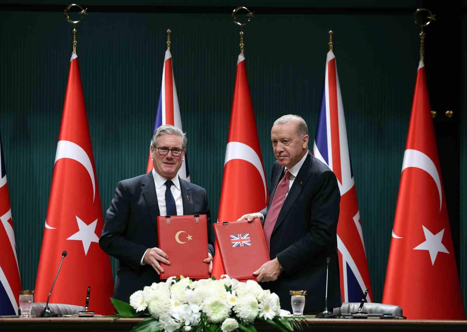 Cumhurbaşkanı Recep Tayyip Erdoğan, "Eurofighter Typhonn savaş uçaklarının tedarikine dair uygulama düzenlemeleri heyetlerarası görüşmelerde imzalandı. Bu mutabakatı iki yakın müttefik olarak aramızdaki stratejik ilişkilerin yeni bir nişanesi olarak görüyorum. Birleşik Krallık ile bu iş birliğimizin savunma sanayiinde müşterek projelere de kapı aralayacağına inanıyorum" dedi.Cumhurbaşkanı Recep Tayyip Erdoğan ve İngiltere Başbakanı Keir Starmer, iki ülke arasında Eurofighter Typhoon savaş uçağı konusunda işbirliği anlaşması imzaladı. İngiltere Başbakanı Starmer'i Türkiye'de ağırlamaktan memnuniyet duyduğunu belirten Cumhurbaşkanı Erdoğan, "Stratejik ortak ve müttefik ülkeler olarak ikili konuların ötesinde uluslararası gündemi meşgul eden birçok meselede kendisiyle yakın diyaloğumuz var. Bugünkü görüşmelerimizin odağını ticaret ve savunma ilişkilerimiz teşkil etti. Malumunuz Birleşik Krallık ülkemizin en büyük ticaret ve yatırım ortakları arasında. Ticaret hacmimizi ilk etapta 30 milyar dolar, ardından 40 milyar dolara çıkarma kararlılığındayız" dedi.Cumhurbaşkanı Erdoğan, İngiltere ve Türkiye arasındaki ekonomik ilişkileri daha da güçlendirmek hususunda kararlı olduklarını vurguladı. Serbest ticaret anlaşmasının güncellenmesi dahil birçok tedbiri ilgili kurum ve kuruluşların ele aldığının altını çizen Cumhurbaşkanı Erdoğan, "Üçüncü ülkelerde ortak yatırımlar yapma imkanları üzerinde de duruyoruz. Enerji ve savunma sanayii alanında yeni ortaklıklar kurmayı hedefliyoruz. Ayrıca çok sayıda Birleşik Krallık vatandaşının Türkiye'yi ikinci evi olarak görmesinden büyük memnuniyet duyuyoruz. Bu potansiyeli en iyi şekilde değerlendirmek amacıyla aramızda ikili işbirliği çerçeve belgesi imzalanmasına yönelik müzakerelere de başladık. İnanıyorum ki bu adımlarla ilişkilerimizi ve stratejik ortaklığımızı çok daha ileri bir seviyeye süratle taşıyacağız" değerlendirmesini yaptı.Cumhurbaşkanı Erdoğan, Eurofighter Typhoon savaş uçaklarının tedarikine dair uygulama düzenlemelerinin heyetler arası görüşmelerde imzalandığını belirterek, "Biz de az önce Sayın Starmer'la bu konudaki iş birliği beyanına huzurlarınızda imza attık. Bu mutabakatı iki yakın müttefik olarak aramızdaki stratejik ilişkilerin yeni bir nişanesi olarak görüyorum. Süreç boyunca Eurofighter Konsorsiyumu nezdinde Birleşik Krallık'ın yürüttüğü çalışmalardan ötürü Sayın Starmer ve ekibine teşekkür ediyorum. Konsorsiyum üyesi diğer müttefik ülkelerin liderlerine de yapıcı tutumlarından dolayı takdirlerimi bildiriyorum" diye konuştu.İngiltere ile yapılan bu işbirliğinin savunma sanayiinde müşterek projelere de kapı aralayacağına inandığını kaydeden Cumhurbaşkanı Erdoğan, "Bugün ayrıca değerli dostumla birlikte Gazze'deki gelişmeleri bir kez daha değerlendirme imkanı bulduk. Bu vesileyle Sayın Başbakanı, Filistin Devleti'ni tanıma kararı almalarından ötürü bir kez de sizlerin huzurunda şahsım, milletim adına tebrik ediyorum. Biz bu karara iki devletli çözüm yolunda cesur bir adım olarak bakıyoruz. Yaklaşan kış şartlarını dikkate alarak Gazze halkının ihtiyaç duyduğu insani yardımların ulaştırılması büyük önem arz ediyor. Bu konuda Birleşik Krallık'la da birlikte adımlar atacağımıza inanıyorum. Gazze'de sağlanan ateşkesin korunması ve ihlallerin önlenmesi noktasında da hepimize sorumluluklar düşüyor. Bunun için özellikle İsrail'deki mevcut hükümetin dizginlenmesi gerekiyor" dedi.Ukrayna'daki son gelişmeleri de Starmer ile değerlendirdiklerini sözlerine ekleyen Cumhurbaşkanı Erdoğan, "Dördüncü yılını tamamlamakta olan bu savaşın bir an önce adil bir barışla çözüme kavuşturulması yönünde ortak duruşumuzu teyit ettik. Suriye'deyse kalıcı istikrarın Suriye hükümetinin desteklenmesiyle mümkün olacağını bugünkü görüşmelerimizde vurguladık. Tabiatıyla bu çabalar sürdürülürken iç ve dış aktörlerin ülkeyi istikrarsızlığa sürükleme çabalarının da önlenmesi gerektiğinin önemi üzerinde durduk" şeklinde konuştu."Birçok farklı konuda birlikte yapabileceğimiz şeyler var"Türkiye-İngiltere ilişkilerinde yakalanan ivmenin önemine değinen İngiltere Başbakanı Keir Starmer ise, "Bu gerçekten çok önemli ilişkiyi güçlendirme fırsatımız var. Her iki ülke Avrupa'nın iki ucunda olabilir ancak birlikte şu anda eskisine oranla çok daha yakın çalışan iki ülkeyiz. Avrupa'nın ortak güvenliği için NATO müttefikleri olarak çalışıyoruz. Ukrayna'yı yine Gönüllüler Koalisyonu çerçevesinde destekliyoruz. Ve Orta Doğu'da da barış için birlikte çalışıyoruz. Bu anlamda sizin oynamış olduğunuz rolün özellikle altını çizmek isterim. Gazze'deki barış planının ilk aşaması yerine geliyor. Şu anda da bu anlaşmanın mümkün olduğunca kısa bir süre içerisinde uygulanması aşamasındayız ve bölgeyi çok daha iyi bir noktaya getirmeye çalışıyoruz. Tabii ki ortaklığımız, ticaret, yeni modern bir serbest ticaret anlaşmasının müzakeresi dahil olmak üzere güvenlik, terörizmle mücadele, göç, enerji ve birçok farklı konuda birlikte yapabileceğimiz şeyler var" dedi."Türkiye giderek artan ekonomik ve stratejik öneme sahip"Türkiye 'nin giderek artan ekonomik ve stratejik öneme sahip olduğunu vurgulayan Starmer, "Burada çok büyük bir adım attık bugün ve stratejik bir ortaklığı duyuruyoruz. İlk Birleşik Krallık-Türkiye ikili işbirliği çerçevesini burada duyuruyoruz. Ve bu gerçekten çok önemli, şu anda mevcut olan işbirliğimizin derinliğini artıracak ve bunu daha ileriye taşıyacak bir adım. Bütün bunun kalbinde bugün imzalamış olduğumuz anlaşma var. Birleşik Krallık, Türkiye'ye 20 Eurofight