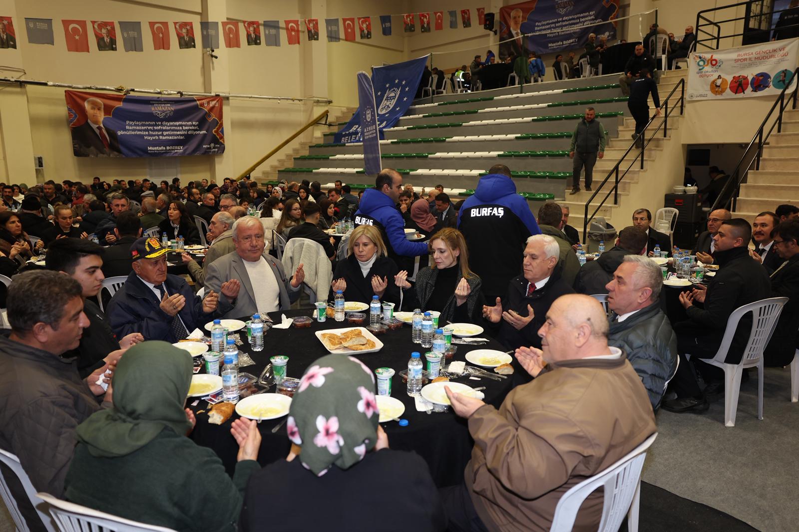 Ramazan ayı boyunca her gün farklı bir ilçede düzenlediği iftar programıyla yüzlerce insanı buluşturan Bursa Büyükşehir Belediyesi, kardeşlik sofrasını bu kez Keles ilçesinde kurdu. Keles Spor Salonu’ndaki programa, Bursa Büyükşehir Belediye Başkanı Mustafa Bozbey ve eşi Seden Bozbey, CHP Keles İlçe Başkanı Cevat Acar, Tarım Peyzaj AŞ Genel Müdürü Sedat Akar, Büyükşehir Belediyesi bürokratları, muhtarlar, meclis üyeleri, sivil toplum kuruluşlarının temsilcileri ve çok sayıda vatandaş katıldı. İlçede büyük bir coşkuyla karşılanan Başkan Mustafa Bozbey, masaları tek tek gezerek Keleslilerle sohbet etti.