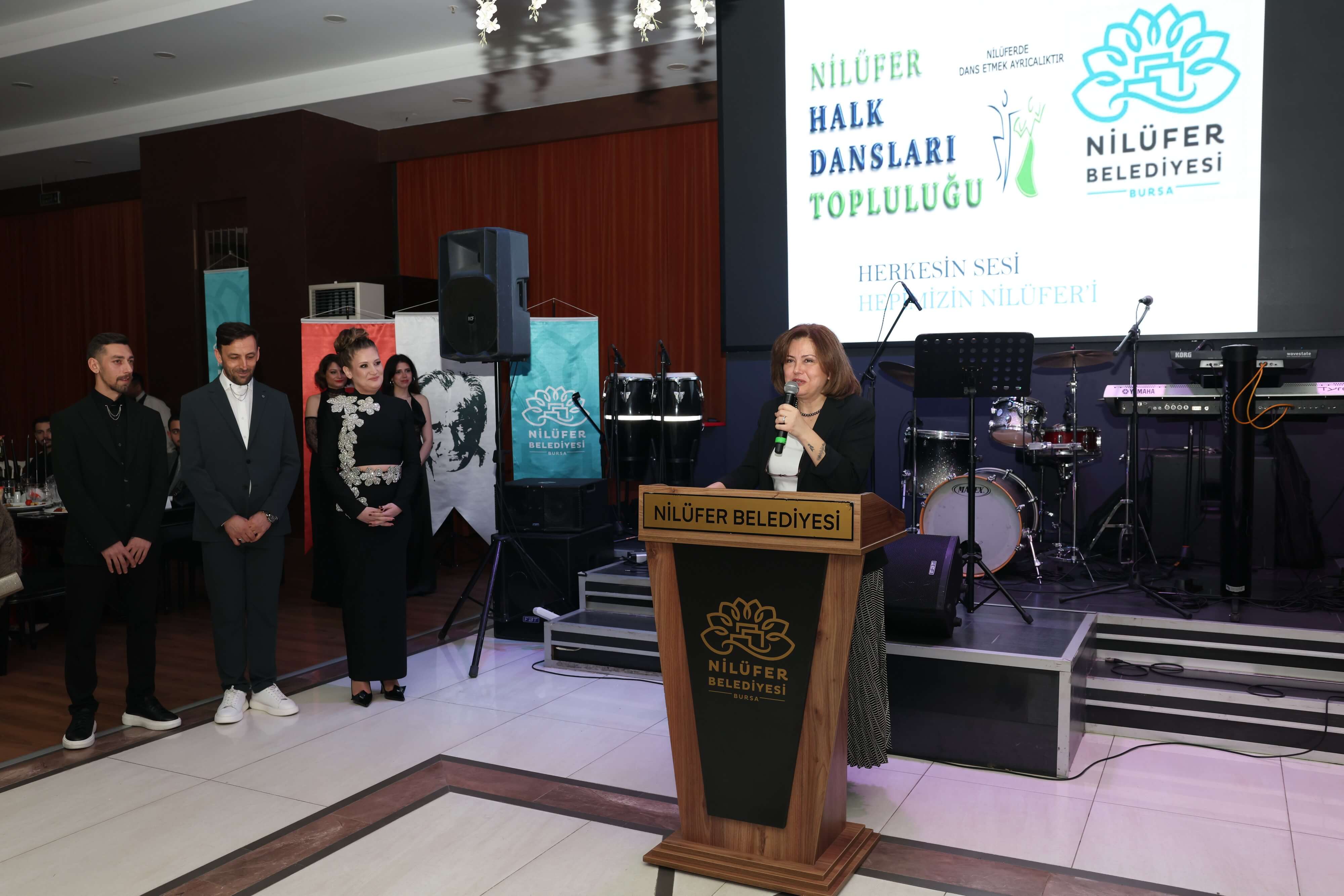 Bukle Erman gecede yaptığı konuşmada, 2001 yılında kurulan topluluğun şu anda Minik, Yıldız, Genç, Gösteri ve Master Grupları ile yaklaşık 300 dansçıdan oluştuğunu söyledi. Anamur, Aydın, Bursa, Van, Bilecik, Silivri, Fethiye, Bolu, Tokat, Üsküp, Karadeniz, Roman ve Gaziantep yörelerinin yanı sıra; repertuvarına 2005 yılında Denizli ve Artvin yörelerinin de eklendiğini söyledi. Erman, Türkiye’de ilk kez müzikli olarak sahnelenen Kılıç Kalkan oyununun, topluluğun repertuvarındaki özgün çalışmalardan biri olarak öne çıktığını dile getirerek, “Nilüfer Halk Dansları Topluluğu, 25 yıldır sahnede sergilediği her adımda kültürel mirası geleceğe taşımayı sürdürüyor. Nilüfer Belediyesi olarak kültüre ve sanata verdiğimiz destekle bu yolcuğa omuz vermeye devam edeceğiz” dedi.