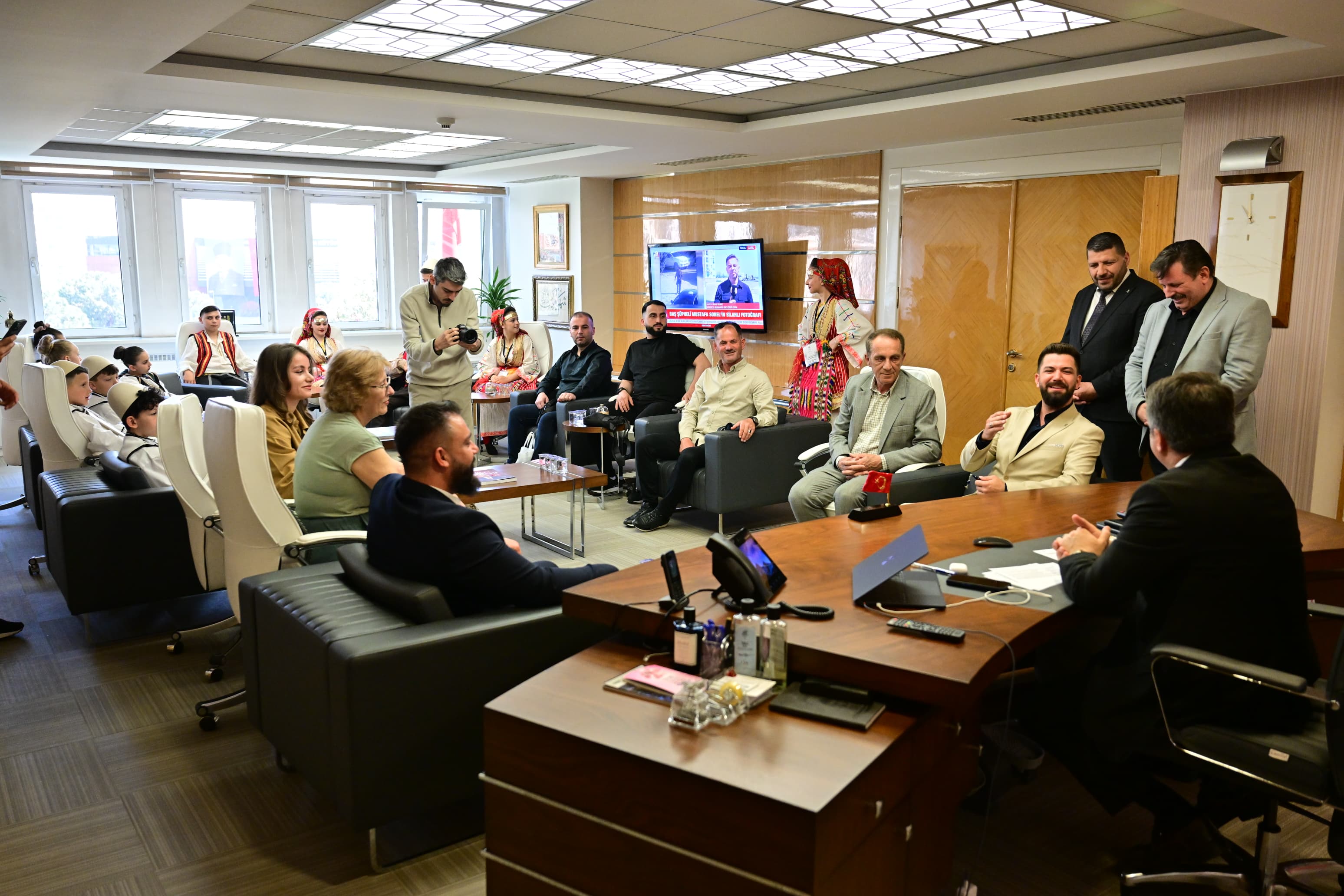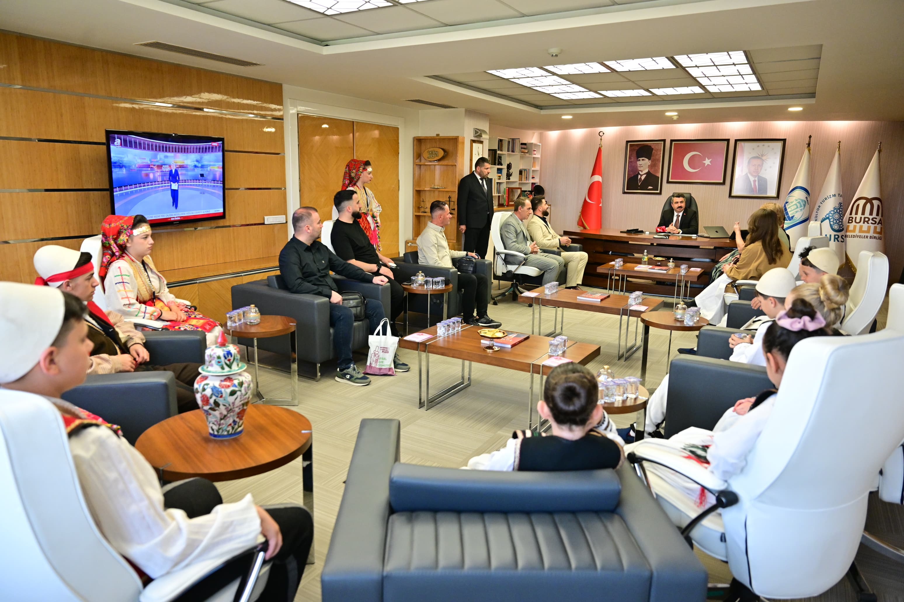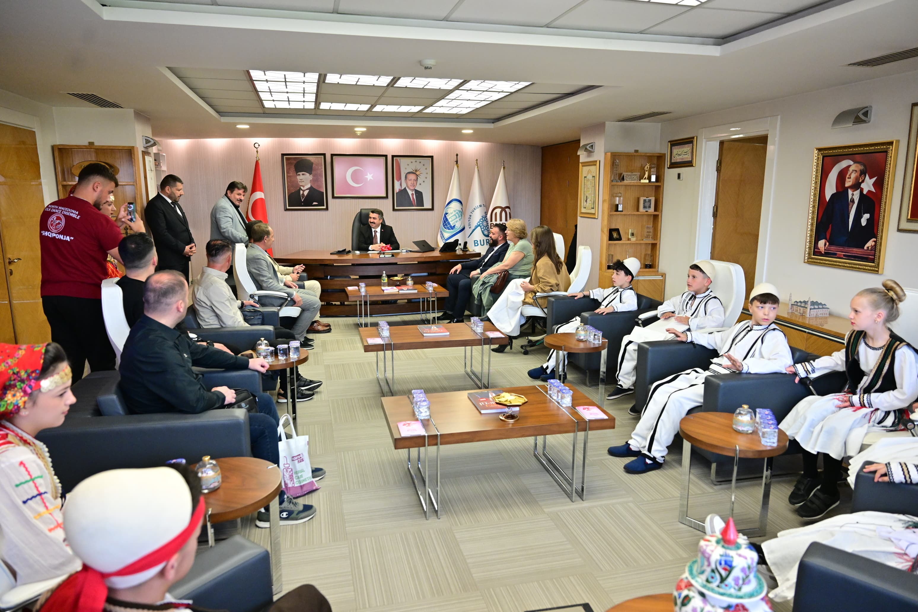 23 Nisan Ulusal Egemenlik ve Çocuk Bayramı, Yıldırım’da sınırları aşan bir coşkuyla kutlanıyor.23 Nisan Ulusal Egemenlik ve Çocuk Bayramı kutlamaları için Bursa’ya gelen Kuzey Makedonya ve Kosova halk dansları topluluğu üyesi çocuklar, Yıldırım Belediye Başkanı Oktay Yılmaz’ı makamında ziyaret etti. Başkan Oktay Yılmaz, çocuklarla yakından ilgilenerek sohbet etti. Ziyaretten duyduğu memnuniyeti dile getiren Başkan Oktay Yılmaz, 23 Nisan’ın sadece Türkiye için değil tüm dünya çocukları için özel bir gün olduğuna vurgu yaparak, “23 Nisan Ulusal Egemenlik ve Çocuk Bayramı, Gazi Mustafa Kemal Atatürk tarafından sadece Türk çocuklarına değil, tüm dünya çocuklarına armağan edilmiş eşsiz bir bayramdır. Bu yönüyle barışın ve kardeşliğin en güçlü sembollerinden biridir” dedi. Kosova ve Kuzey Makedonya ile Türkiye arasındaki bağların güçlü olduğuna vurgu yapan Yılmaz, “Balkan coğrafyasıyla aramızda sadece coğrafi değil, tarihsel ve kültürel olarak da çok derin bağlar bulunuyor. Kosova ve Kuzey Makedonya’dan gelen evlatlarımızı burada görmek, bu kardeşliğin en güzel göstergesidir. Ortak tarihimiz, kültürümüz ve gönül bağımız bizleri her zaman bir arada tutacaktır” ifadelerini kullandı.